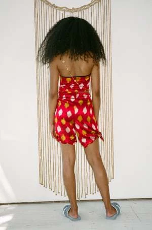 Trinity is 5’6 and wears with the Parau Top in Nsuo Appliqu, Tyre Slide in Blue Velvet, and Carpathia Top in Pomegranate Ikat.