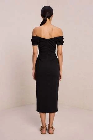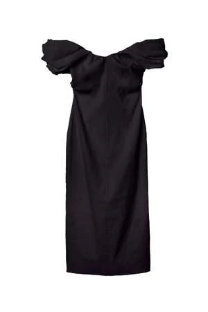 The Nora Dress is crafted from a compact stretch linen fabric in timeless black. This midi silhouette features a romantically draped strapless sweetheart neckline and off-the-shoulder sleeves with shape-accentuating seam detailing