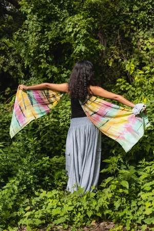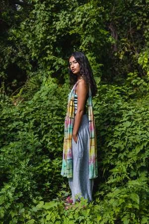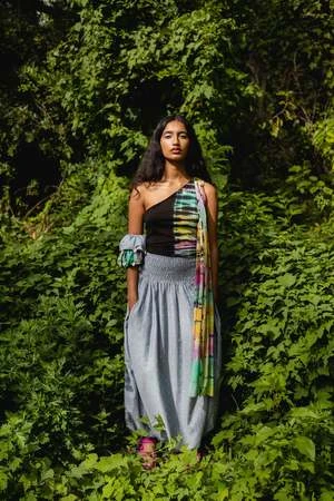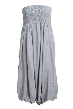This style can be worn as pants or as a strapless jumper/dress, with elastic smocking at the top stretching to fit. Inseam pockets at front. This time we added a side cargo packet as well.
