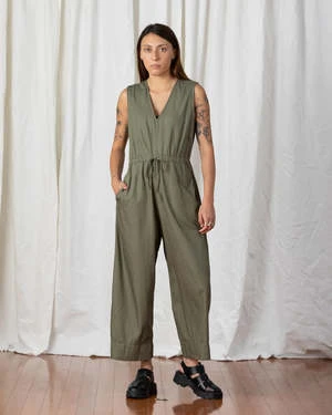 : V-neck sleeveless jumper with back slit opening, drawstring at waist, pockets and relaxed fit. Length hits above ankle Pre-washed + pre-shrunk.