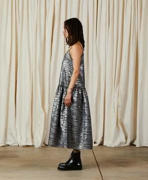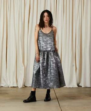 Silver Jacquard print drop waist dress with ruffle detail at skirt and adjustable spaghetti strings.