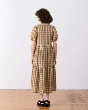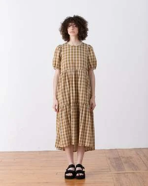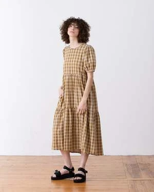 Dress with puff sleeves and tiered skirt. Keyhole button closure at center back and side seam pockets. This dress is running a bit small 🙂