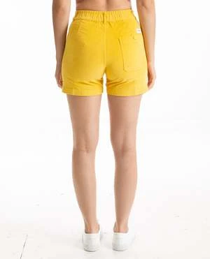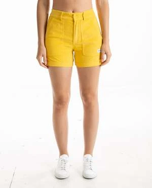 Big Bear Walkshort Lemon in yellow by Banks Journal. Piece dyed, Contrast panel, High waisted, Back elastic waistband, Zipper and button closure, Porkchop pockets and back pocket, Stone washed for hi-low effect, Recycled polyester woven labels, FSC approved paper swing tags.