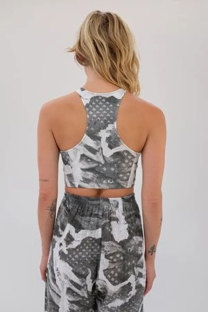 Organic cotton-lycra jersey bra top in limited edition black and white Fish Tissue print. Front panel is lined with extra support.
