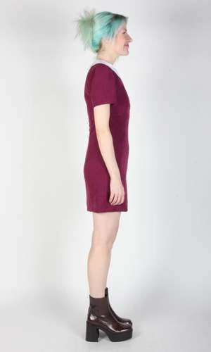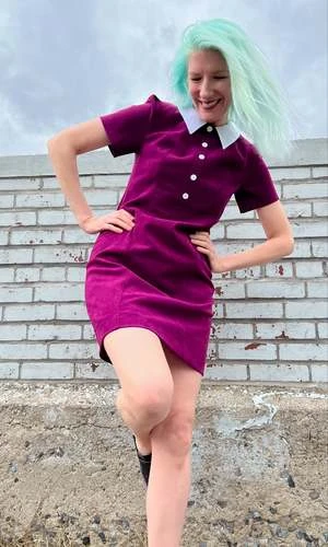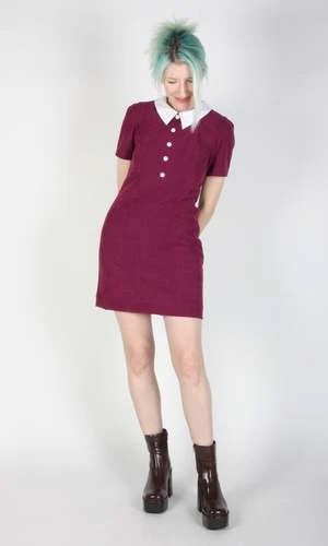 Peep is a tailored, panelled dress with a little white collar, white buttons, and short sleeves. Its fully lined in soft stretch satin, and closes with a back invisible zipper.
