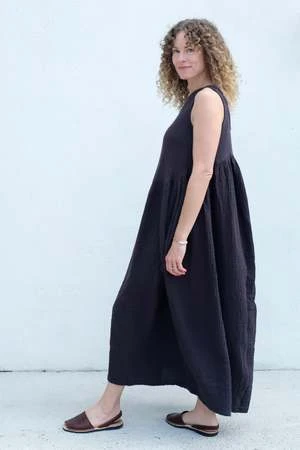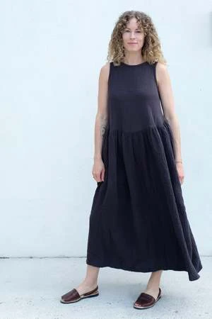 Relaxed fit sleeveless dress with dropped waist and flowing, fully shirred skirt. Textured cotton blend. Scoop neckline. The perfect throw-on-and-go dress for the warmer months.