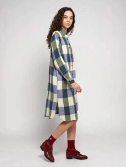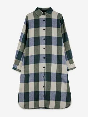 100% cotton navy blue dress. Designed with tailored collar, front button fastening, buttoned cuffs, side pocket and mid-length. It has a relaxed fit. Made in India.