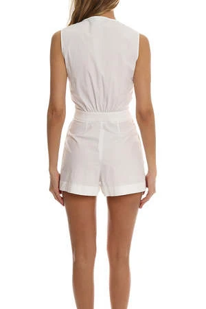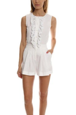 A carefree tank style Pleated Romper by Boutique Moschino. Fun ruffle details along the button down placket, pleated details on the shorts and side pockets.