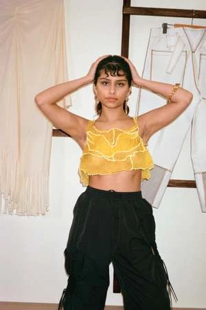 Aysha is 5’3 and wears Size 2 with the Flower Pants in Black, Soleil Earrings in Super Nova, and Heart Burn Necklace in Gold, holding the Vida Bowl in Sol.