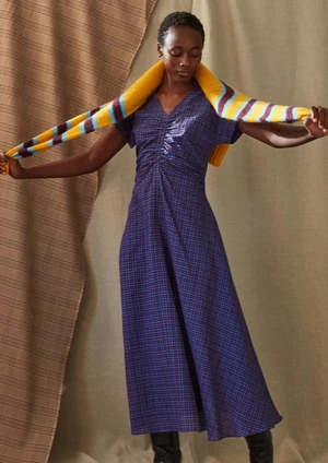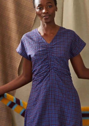 A short sleeve, full-length dress from Caron Callahan with ruching down the front and back. Features a v-neck and is slightly A-line in shape. A super flattering fit and easy to wear and layer over when the weather gets cold. Fabricated in a puckered mini-plaid fabric and unlined.