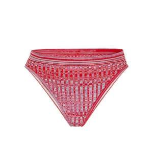 This brief is knitted with a mix of red, turquoise and pink yarn. Every brief has a unique pattern of lines.