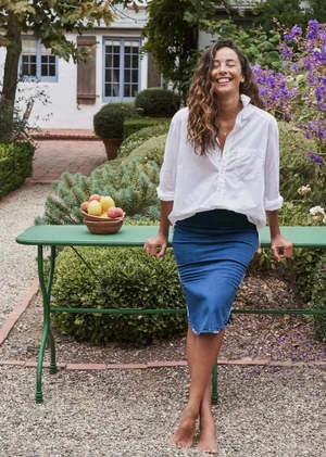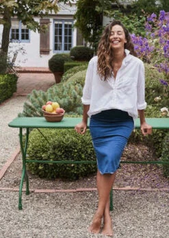 Meet the super-fitted denim skirt that does it all. Donegal’s easy-to-move-in silhouette with controlled crinkles (that curb actual fabric wrinkles), sexy side slits, and the coolest curved hem bridges that what-do-I-wear-today gap in your closet.