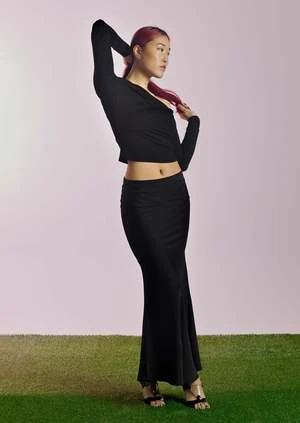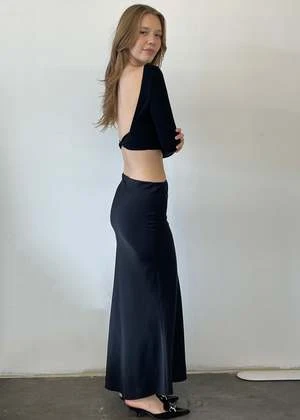 The Verve, a full length bias skirt with a hidden elastic waistband. Fits true to size. Model is wearing a size small.