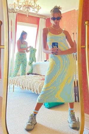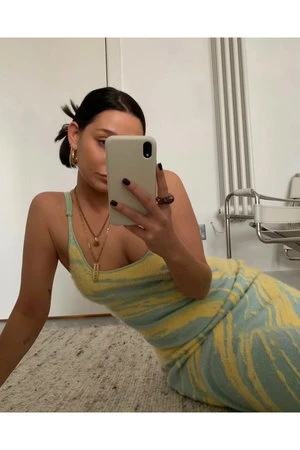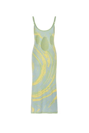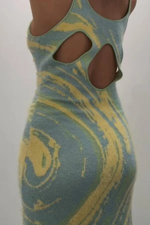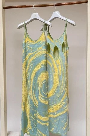 Classic HOS knitted slip dress shape with back cut-out detail and paint print. By using the unique knit technique, this dress is a perfect trans-seasonal style and a great layering piece. Wear with a boot or a trainer to dress this style up or down.