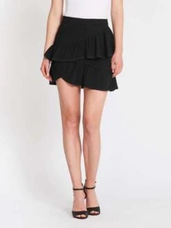 Here in Black, the Mica Skirt by IRO is a beautifully ruffled, layered mini skirt style. Detailed with a banded waistline and visible silver side zip closure.