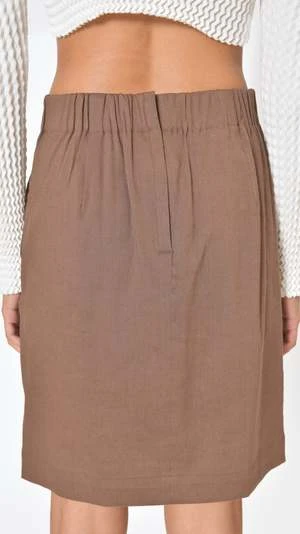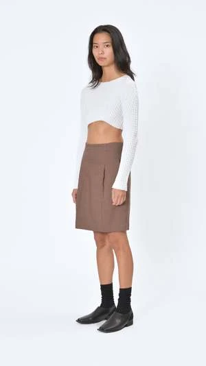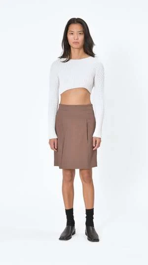 The Peel Skirt is comprised of a stretch fabric in vivid dyed yarn. It is a mini style and features a partial elastic waist with back zip.