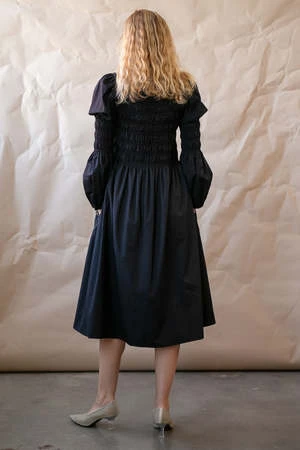 Inspired by our vintage collaboration with Boheme, feminine and easy everyday dress with an open bias-bound neckline, tone-on-tone smocking, bishop sleeves; midi length, pockets.