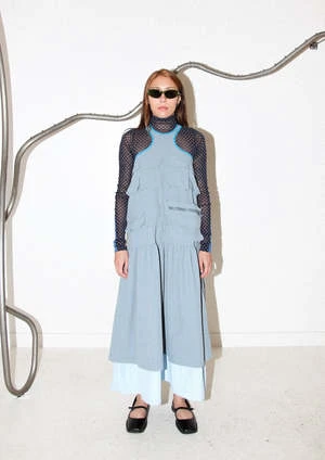 This dress from Los Angeles-based apparel brand KkCo features a dramatic high neckline, maxi length with contrast skirt lining and contrast binding around the neck and armholes. The 12 utility pockets add a playful yet functional charm to the garment. Exposed zipper closure at back neck.