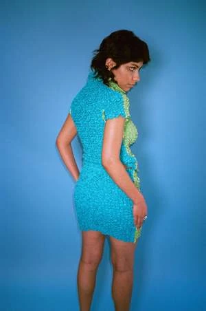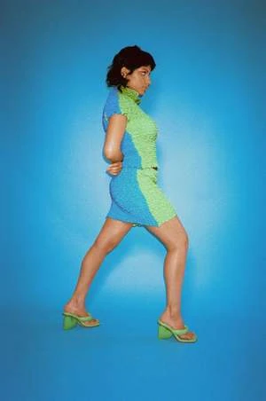 Fitted mini skirt in split colour detailing: a lime green front with an aqua back. Made up of a nylon and spandex blend, this garment has extreme stretch in length and width with lasting recovery and adjustability through the elastic tunneled waist for everyday wear but built to withstand sport.. Features double hand smocking to create a popcorn texture throughout.