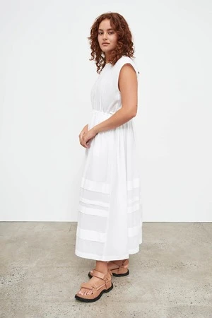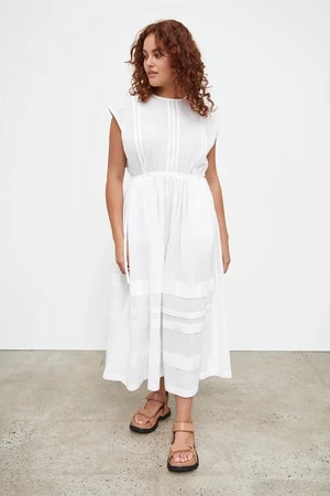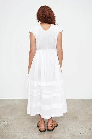 With an oversized silhouette, the Camille Dress features an adjustable drawstring at the waist which can be cinched in or left loose. Made from organic cotton voile, it features pleats through the bodice and folds through the skirt to add dimension while subtle capped sleeves and a rounded neckline ensure ease of wear.