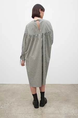 The Juno Dress is an oversized style, with volume created by gentle gathers through the body. It has full, gathered sleeves, and fastens at the back neck and cuffs with narrow ties. Inseam pockets add to the ease of wear. Made from 100% certified Fairtrade organic cotton poplin in a seasonal check. Size down for less volume.