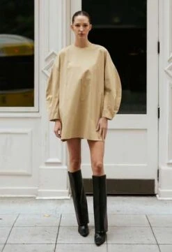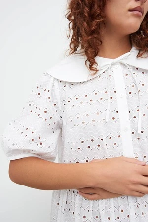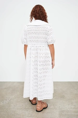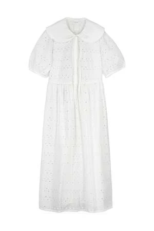 The Lily Dress is cut from Broderie Anglaise with a playful wave texture. Featuring an oversized Peter Pan collar with detachable neck tie and sculptural balloon sleeves, the dress has a relaxed off the body fit. Gentle gathers at the waist add subtle volume to the skirt. Semi-sheer, we recommend pairing with the Lily Slip.