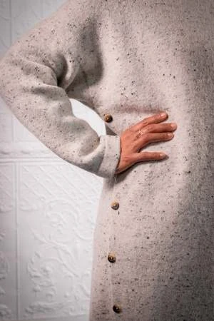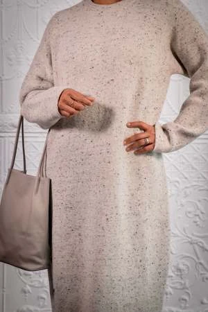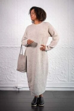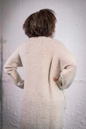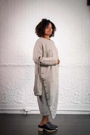 Soft and warm – lofty yet substantial donegal tweed knit. Asymmetrical wood button detail, oversized, drop sleeve, pull on and extremely comfortable. Made in Peru – will fit a variety of body types. Kendra is 5’9 and typically wears a size medium/large she is wearing the size 3, she could size down to a 2 for a more body skimming look. Shown with Are Studio bag and Lauren Manoogian Studio Clogs in black. Hand wash cold, lay flat to dry or dry clean. Content 44% merino, 33% alpaca, 14% acrylic & 6% lycra.