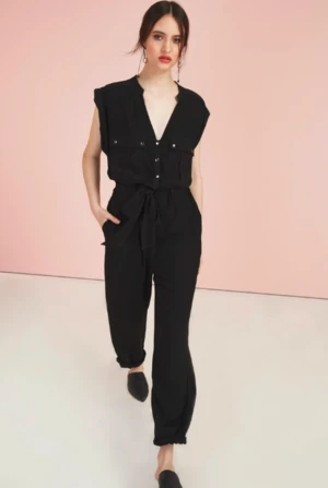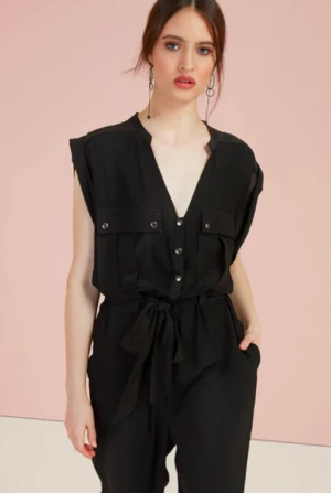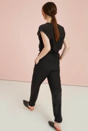 Relaxed fitting jumpsuit featuring a deep v-neck with collar and rolled sleeves. Designed with front button closure, front patch pockets, and a matching fabric belt. Pair with slides for a casual look. Made of 100% viscose with 100% silk detailing.