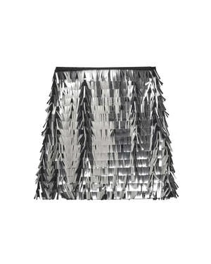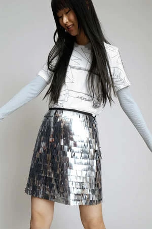 The Loraine Skirt in Silver by Munthe is a bold mini skirt with shimmering, all over sequins and classic a-line silhouette.