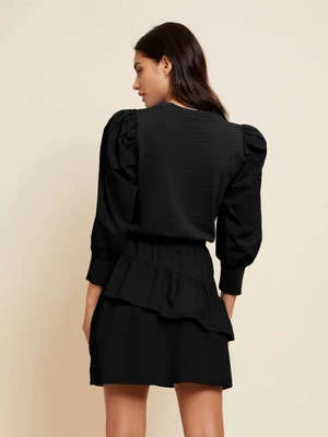 Our versatile mini features a ribbed mock neck, contrast bubble sleeves with ribbed cuffs, an elastic wait and asymmetrical skirt ruffles for a little added edge. Just accessorize to take it from day to night.
