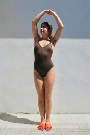 A cross-back one piece with 3/8″ binding and straps and a mid-cut leg for medium coverage.