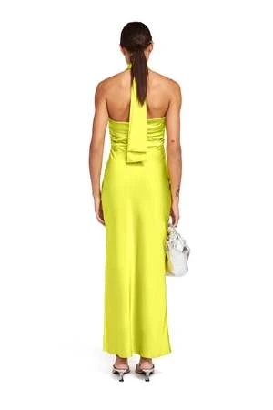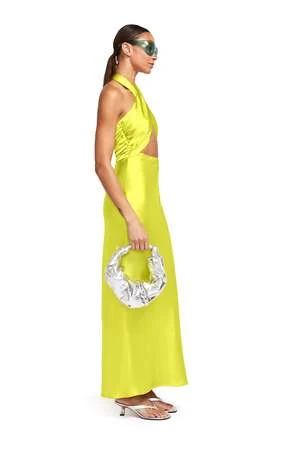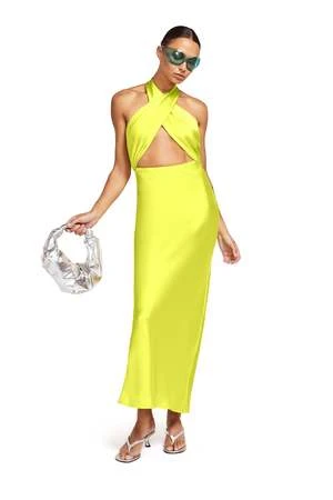 Crossover neckline halter maxi satin dress with bodice cut-out detail. Ties at back neckline.