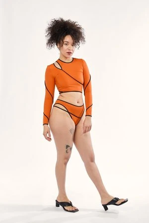 An asymmetrical bikini bottom with playful curves of a mid-rise cut. The detail is at the strap that leads as a spiral from front to back. Pants accent hip line and reveals the attractive womens body curves. The bottom part at the front and tan are lined.