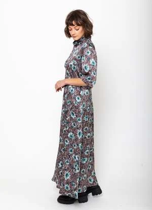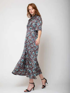 Relaxed A-line turtleneck dress with bustier detail in a painterly daisy print hammered silk. Invisible zipper closure and side slip pockets.