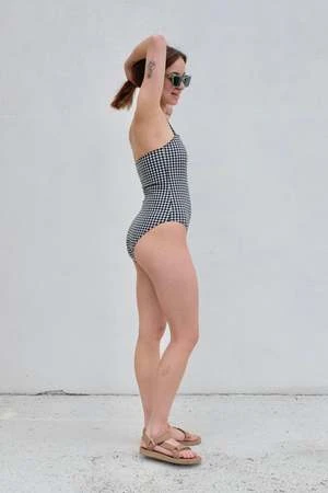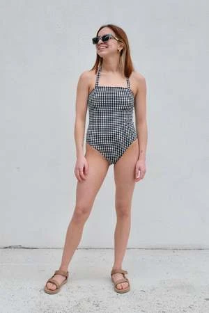 One-piece swimsuit with a straight neckline and adjustable halter straps. Textured gingham print with cheeky coverage.