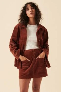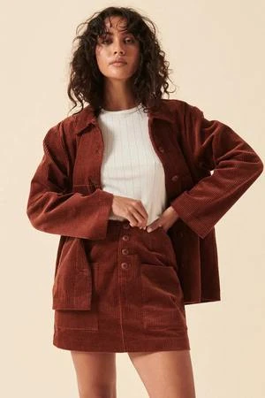 High rise, slim fitting mini skirt with exposed button opening and oversized patch pockets. Rich chestnut color and just the perfect length.