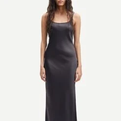 Slim fitting sleeveless midi dress with scooped front and back necklines. Darted bust and waist, hem slit. Bias cut 100% recycled polyester fabric with subtle sheen. This product is GRS certified. Each stage of the supply chain has met strict social, environmental, and chemical requirements.