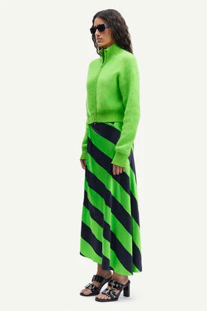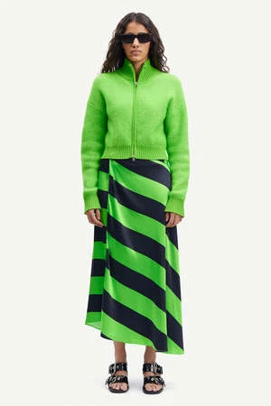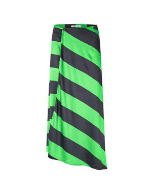 The Viktoria Bias Skirt in Green Stripe by Samsoe Samsoe is a bias cut, wrap-front midi skirt crafted in a bold contrast stripe.