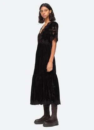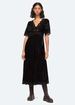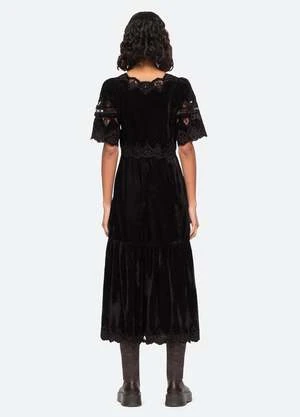 The Eliana embroidered velvet dress features a v-neckline, short puff sleeves and midi silhouette.