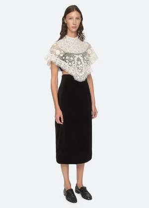A perfect match. The Serita 3 piece set features an intricate crochet lace cape, bralette and high waisted velvet skirt.