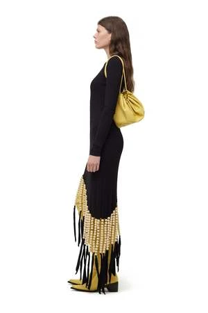 Long sleeve crewneck fine rib midi dress with fringe beaded hem.