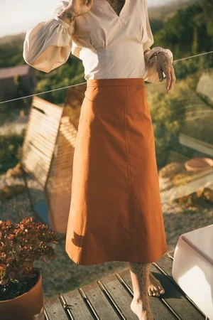 High-rise midi skirt in a beautiful orange satin. Zip-up fastening in the back.