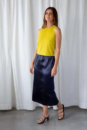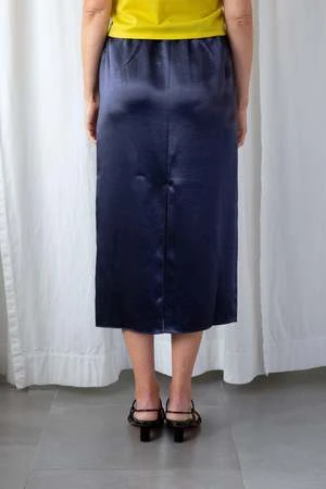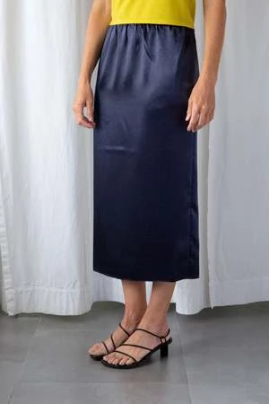Satin slip skirt in dark navy with elastic waistband. Can be styled high or low on the hips.