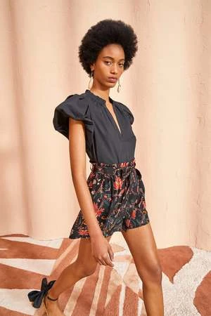 The Leica Short is crafted from 100% silk crepe de chine featuring a stunning black, crimson and green floral print. This elegant open leg short is defined by its paperbag waist and belt tie detail. Finished with side-seam pockets.