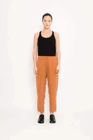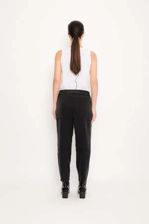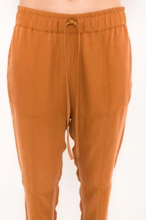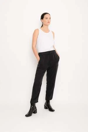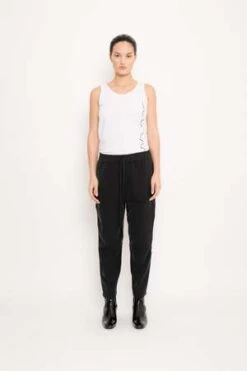 Viscose silk sport pants with cutouts. Elasticized waistband with drawstring. Straight shape.