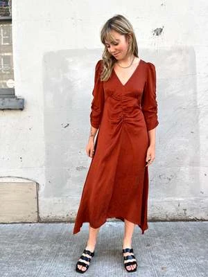 – Ruching details at the front and along the sleeves