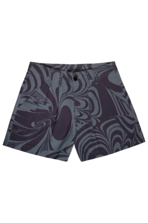 The Maximon shorts features UIM custom hand painted artwork Nuva Dusk. Perfect easy fit pleated shorts cut from soft certified organic cotton twill. Wide leg with two front and back welt pocket.